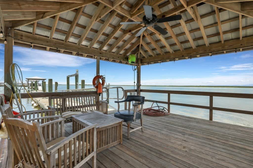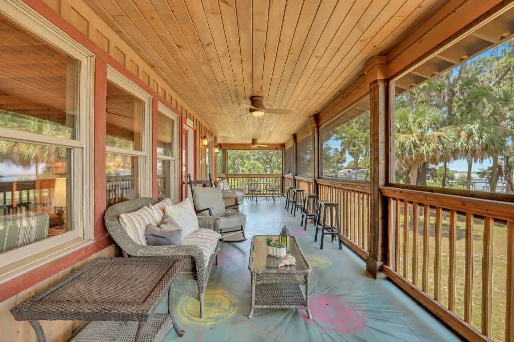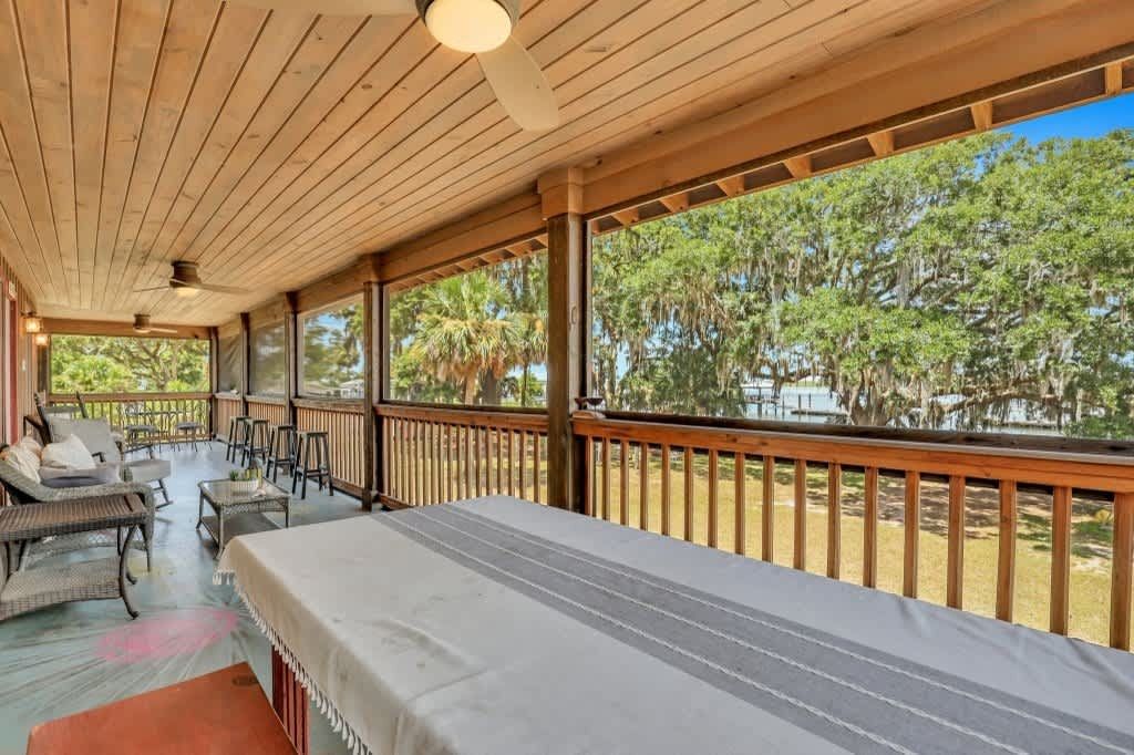 One of the standout features of Gone Daufuskie Retreat is its impressive deepwater dock. One boat slip is included, but contact us if you need to rent more boat slips at a discounted rate. Positioned perfectly for easy access to Savannah, Bluffton, and Hilton Head, this property is a haven for boating enthusiasts. The wraparound porch invites guests to soak in the natural beauty of the area, making it the ideal spot for enjoying sunrises and sunsets alike.
