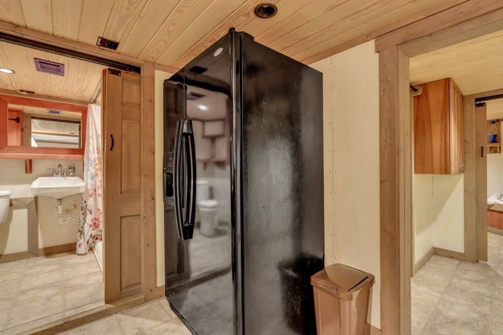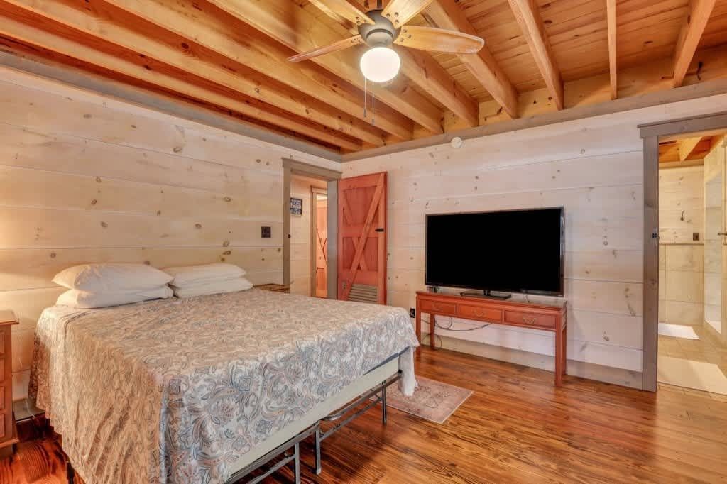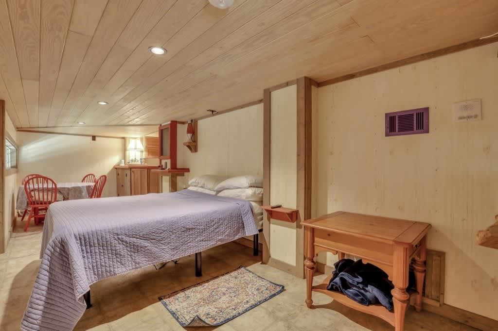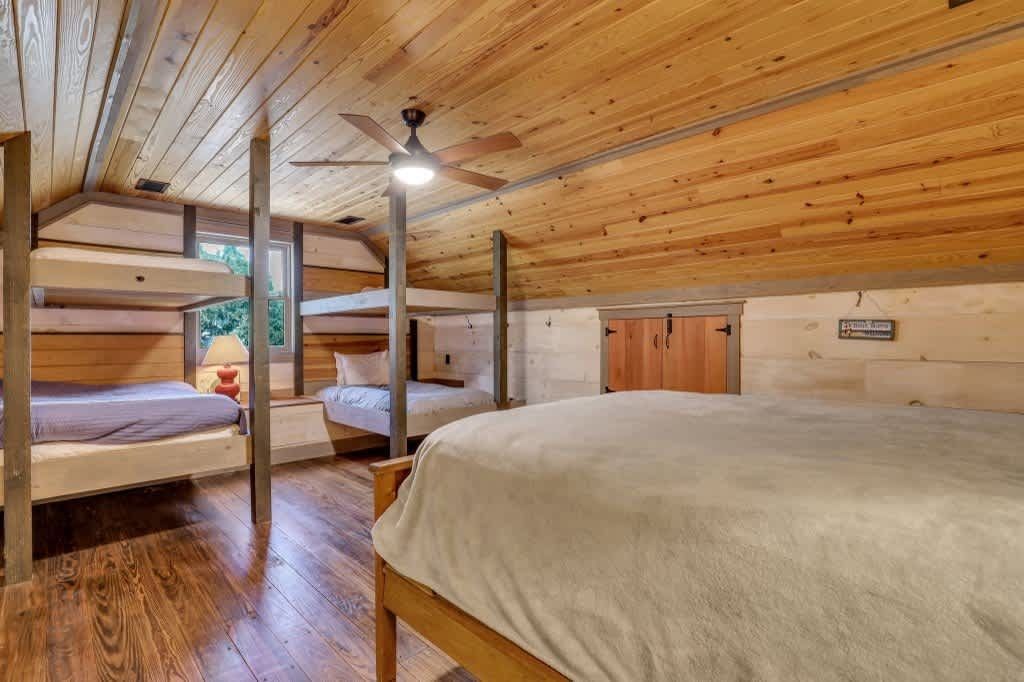 This one-of-a-kind residence features four spacious bedrooms, thoughtfully spread across multiple levels, accommodating up to 14 guests. The main level includes a queen bedroom with a cozy sitting area, a daybed, and a full bath. Upstairs, you'll find a charming setup with two bunk beds and a single bed, along with a full bath. The lower level boasts three queen bedrooms, a full kitchen, and another full bath, providing ample space for family gatherings or vacations with friends.